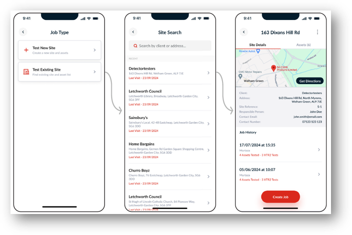 When revisiting a site, there’s no need to start from scratch. DT Connect provides access to the complete site history, including previous reports and saved asset lists, significantly reducing setup time and improving the accuracy of follow-up inspections. From the Site Page, users can view historical data and completed jobs, reuse existing site and asset information to quickly begin new tests, and maintain consistency across visits to support compliance and detailed reporting.